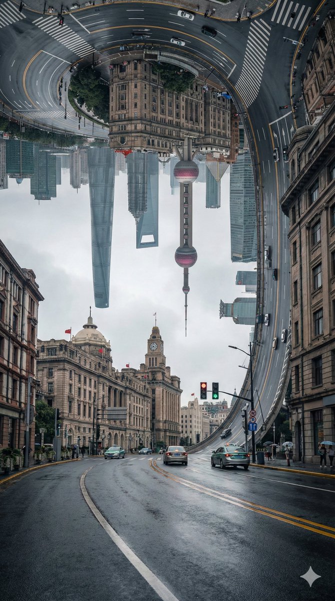 {current_weather} in a gravity-defying {city_name}. The asphalt street curves seamlessly upwards, physically bending 90 degrees to become a vertical wall, then arching directly overhead. Not a reflection, but a solid continuous loop of architecture. Iconic buildings and roads protrude perpendicularly from the curved surface all around. {city_name}'s landmarks hang upside down above. Realistic lighting matching the weather, vivid details, photorealistic 8k. --ar 9:16